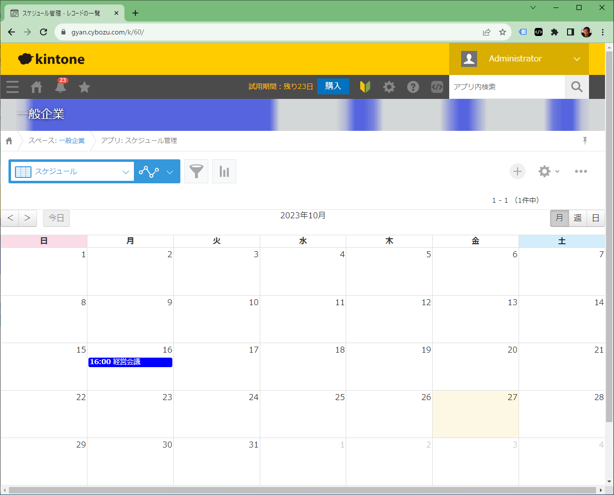 そしてスケジュール管理アプリですが、日時(開始日時、終了日時)、登録者(氏名、所属)、件名、詳細、添付ファイルという項目を配置し、さらに施設予約と連携する場合に、施設を選択できるようにしました。そのうえで登録時に、①該当する日時に施設予約可能かチェックする。②施設予約可能であれば、施設予約のレコードを登録する。③施設可能不可であれば、メッセージを表示し、スケジュールのみ登録する。という処理をJavaScriptで作成し組み込みました。また、スケジュールの変更時には施設予約のレコードも変更するようにし、スケジュールの削除時には施設予約のレコードも削除するようにしました。こちらも一覧はカレンダー形式を採用しました。