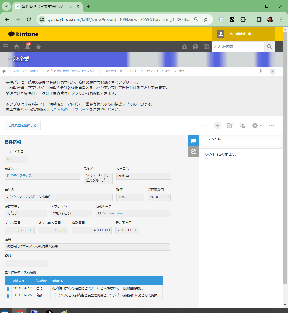 顧客、案件に紐付けて活動の履歴を残すことができるアプリです。顧客管理、および案件管理アプリから情報をルックアップして関連付けることができます。